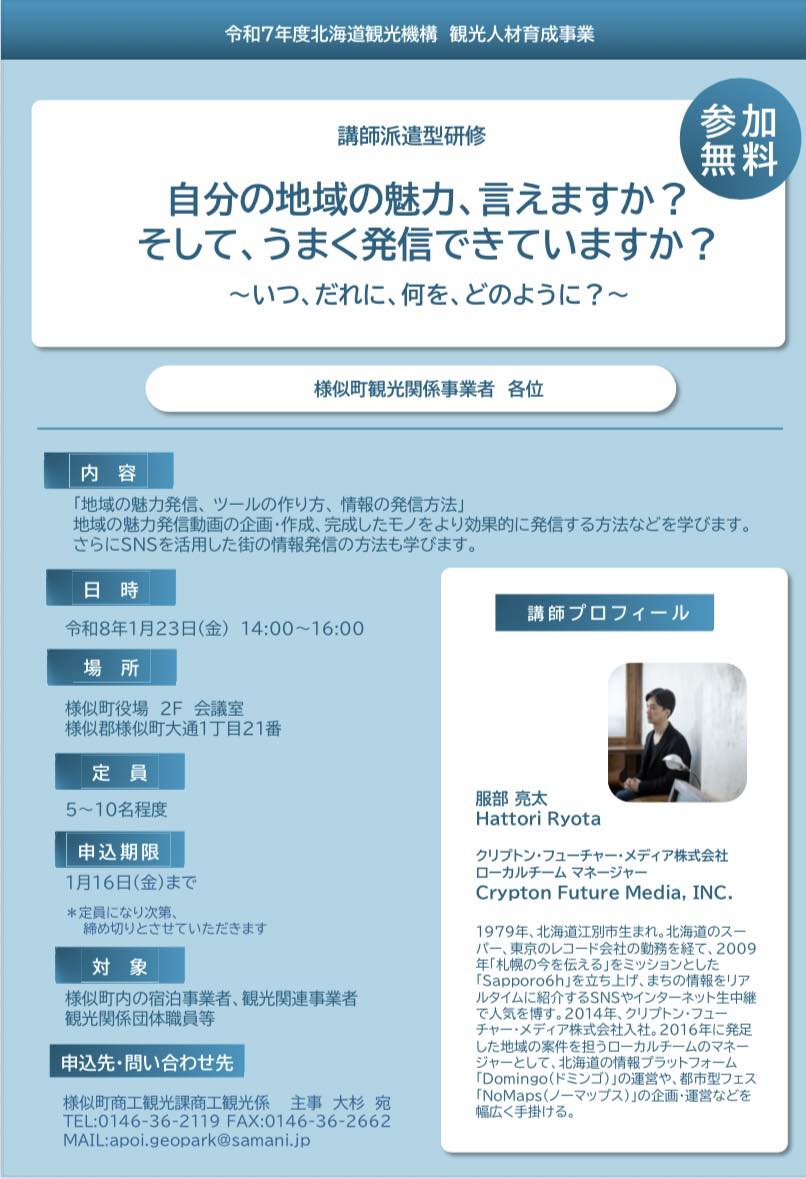 公益社団法人 北海道観光機構から観光人材育成事業の研修が様似町で開催します。