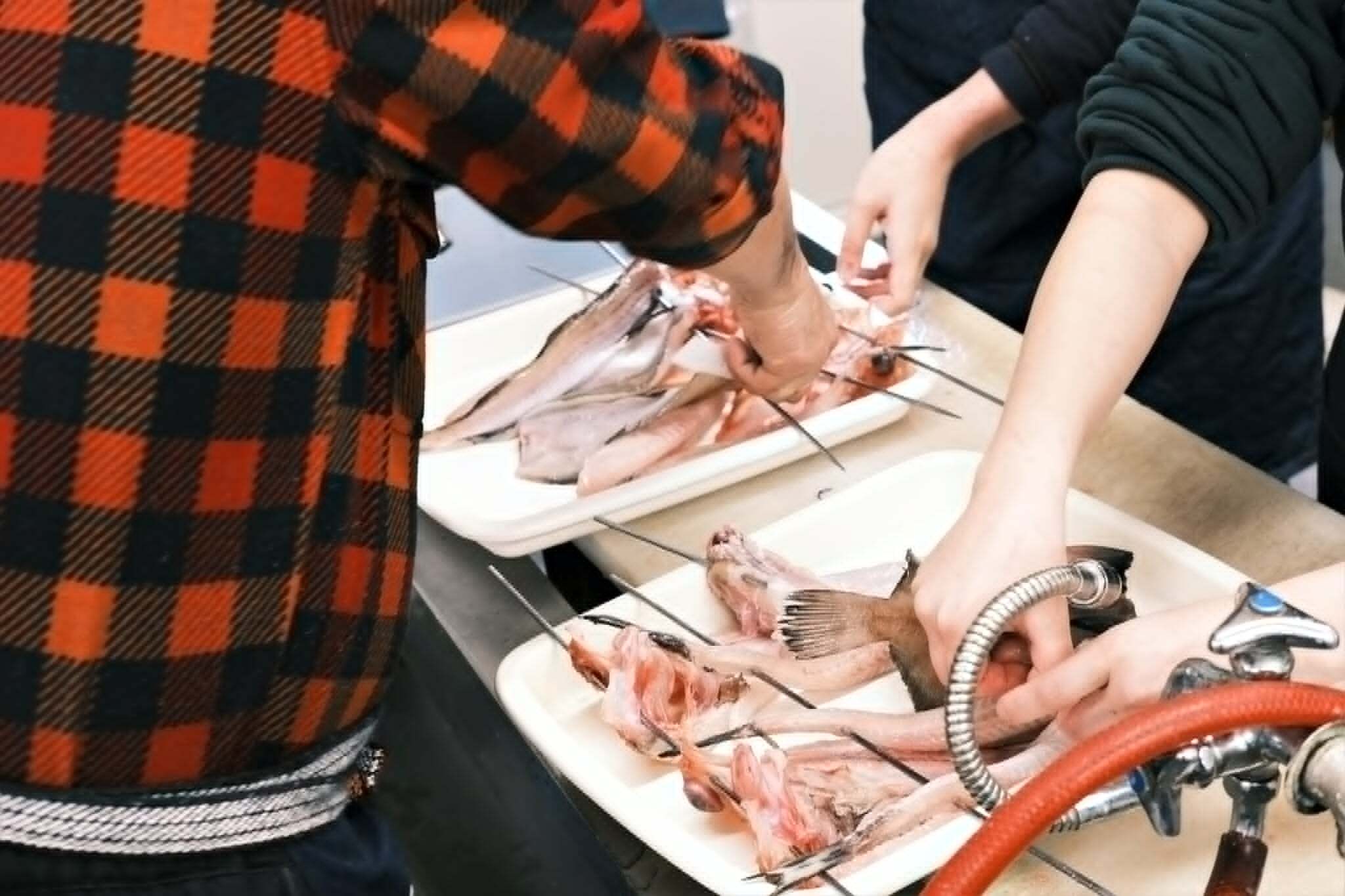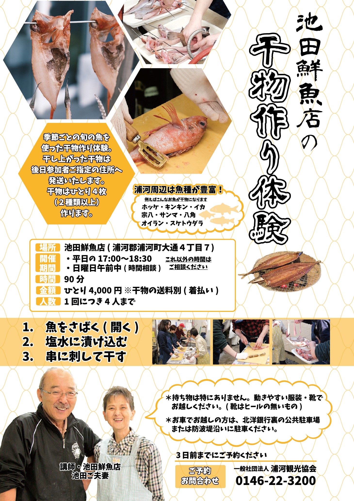 季節ごとの旬の魚を使った干物作り体験。 干し上がった干物は後日参加者ご指定の住所へ発送いたします。 干物はひとり4枚。(2種類以上)作ります。