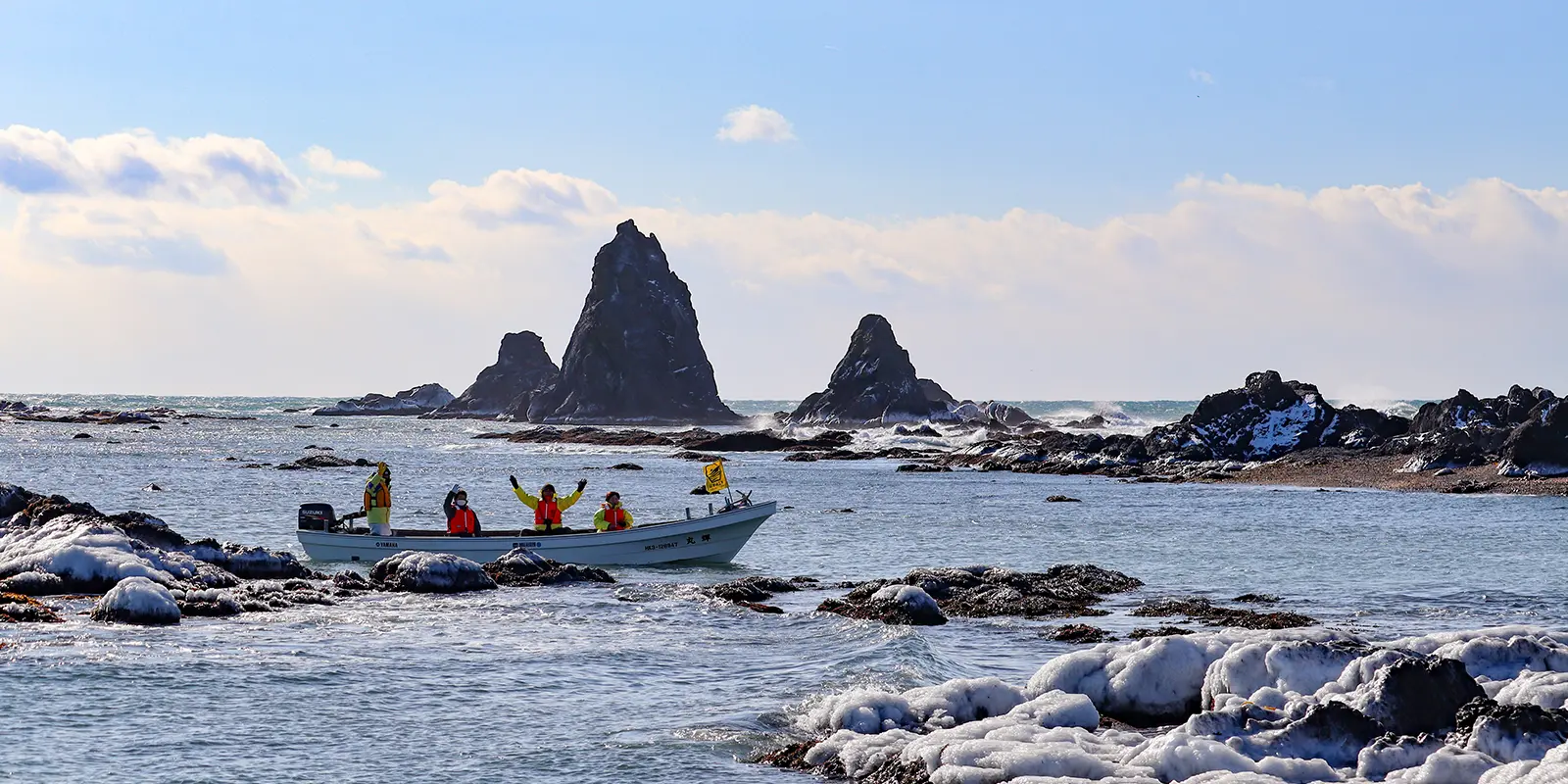 えりも沖を昆布漁船で巡る体験クルーズです。海から見る襟裳岬やゼニガタアザラシの生息地を間近に観察でき、波や風と一体になれるアクティビティです。
