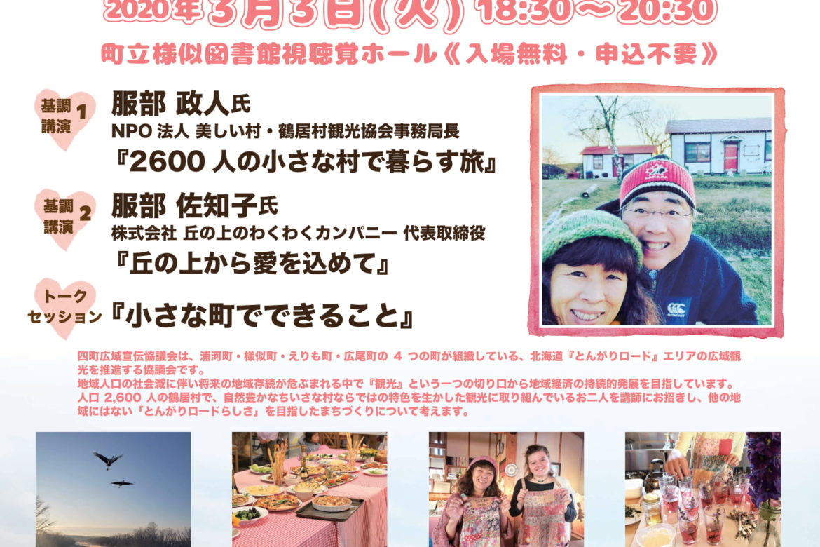 人口2,600 人の鶴居村で、自然豊かなちいさな村ならではの特色を生かした観光に取り組んでいるお二人を講師にお招きし、他の地域にはない「とんがりロードらしさ」を目指したまちづくりについて考えます。